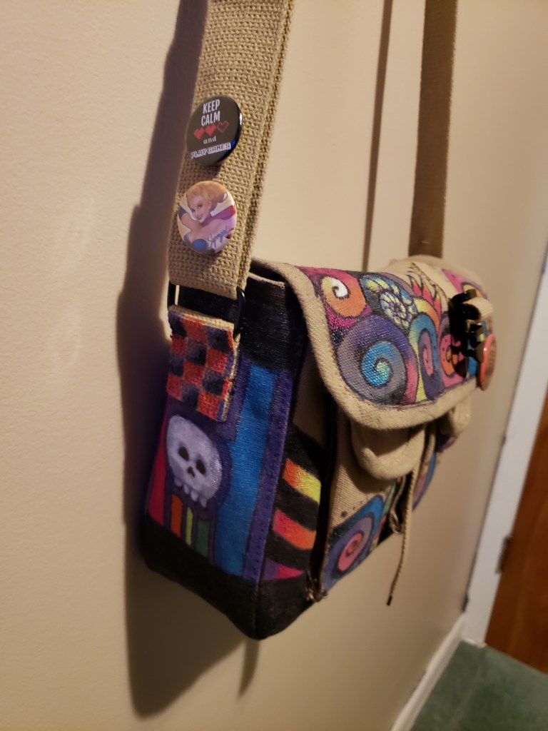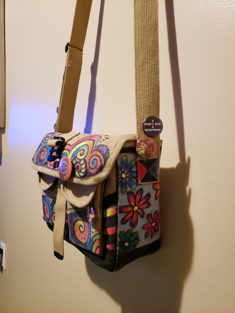 I recently needed a new purse as my old one was falling apart, bits of leather trailing behind me as I walked through the house and parking lots, it was a problem. I decided to get a cheap canvas bag and customize it as a craft project. The plan was to attach buttons, doodle, and maybe apply a vintage patch or two. In reality, I started doodling and realized I could use the nail polish I had (back from my stint as a girly girl) to make my doodles pop. Three days of stinking up the house resulted in a purse that brings a smile to my face when I look at it, it may not be the most adult purse ever, but it is fun. What’s the point of life if it can’t be a little fun now and then?