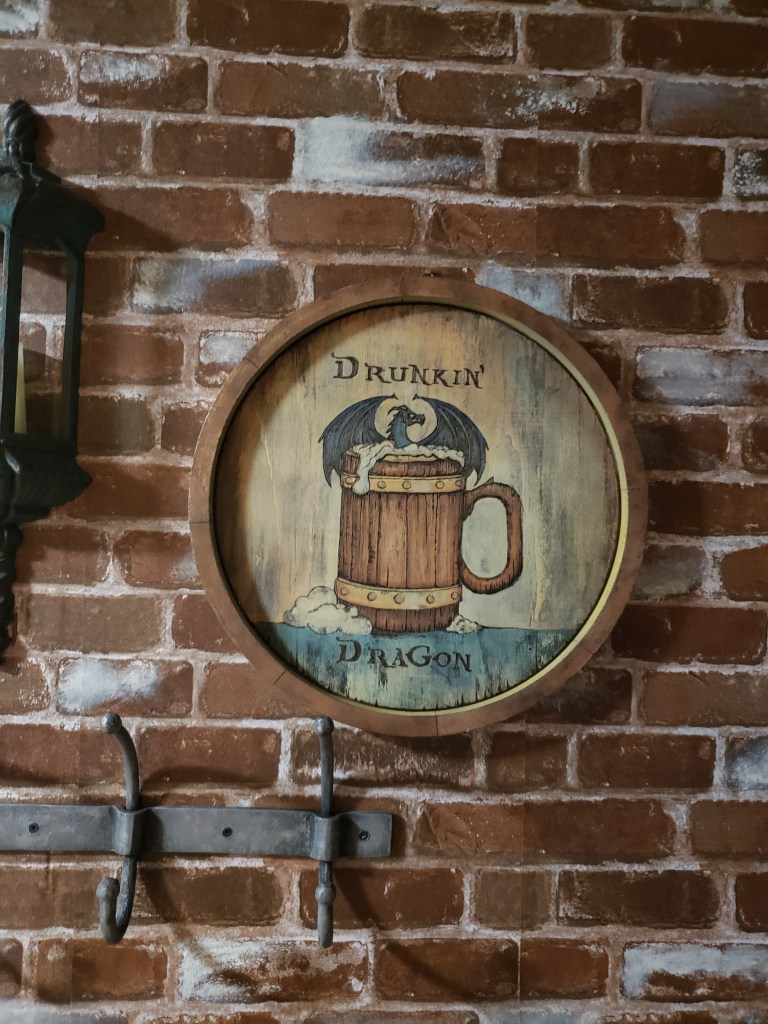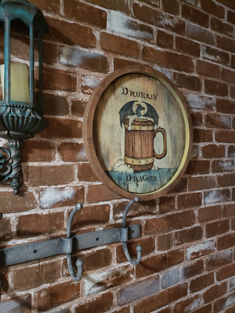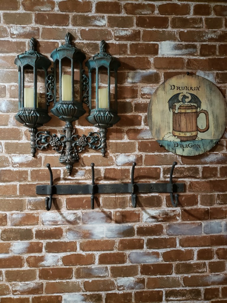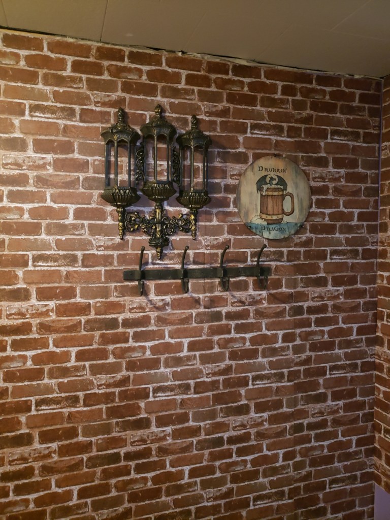 Let me begin with the sign. I batted around a few options for signage for the connected tavern and ultimately went with existing supplies that will probably get beefed up in the future, it doesn’t quite have the presence I’m looking for with it’s current dimensions, so I’ll probably end up gluing it to a chunkier bit of round wood, but I had these circles for another project and had been a bit too excited to get started. I found the type and imagery online and transferred the lines by scribbling on the back of the print outs and tracing the front side to allow light pencil marks to show on the wood I was using. Once done I used my wood burner and watered down paints to tint the areas and finally stained over all of it. You can see it on the wall which is covered by removable brick wallpaper. I’ve never wallpapered before or wrestled giant stickers so I was a complete novice, but it was much faster than trying to paint bricks and it can be restored to boring down the road if needed.
