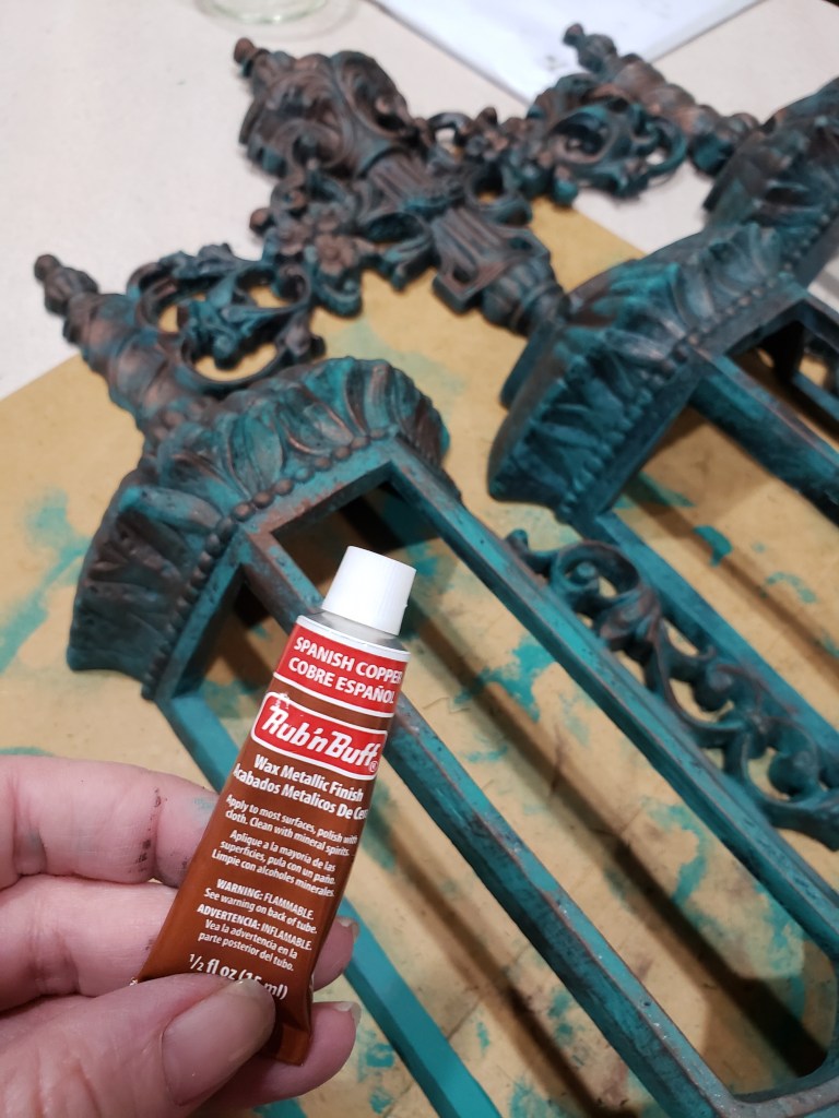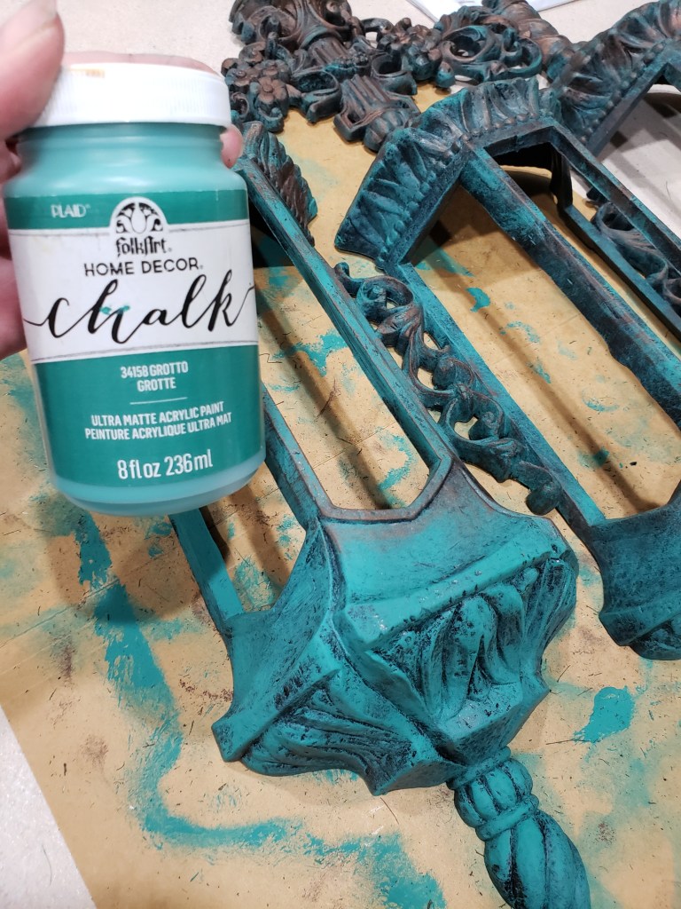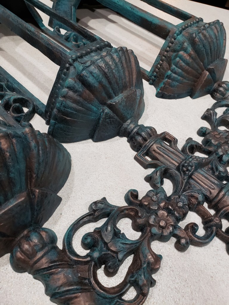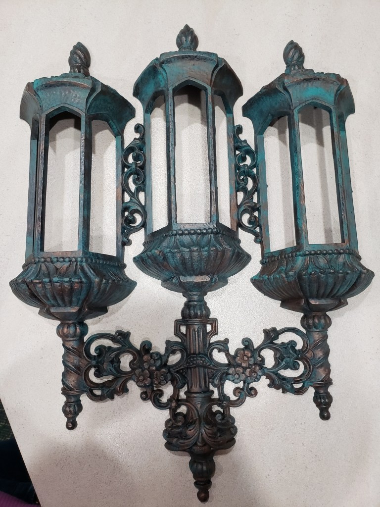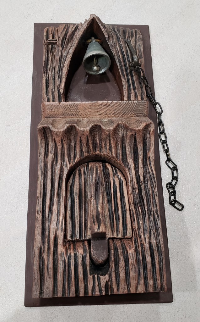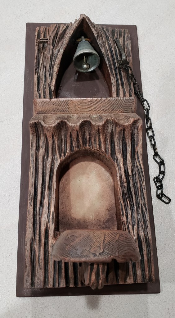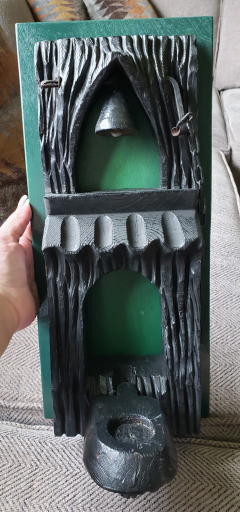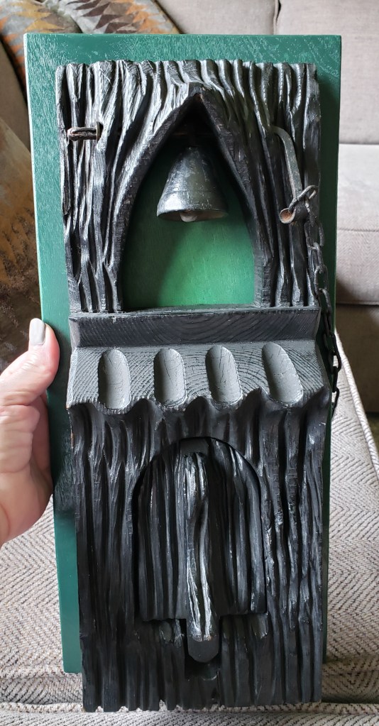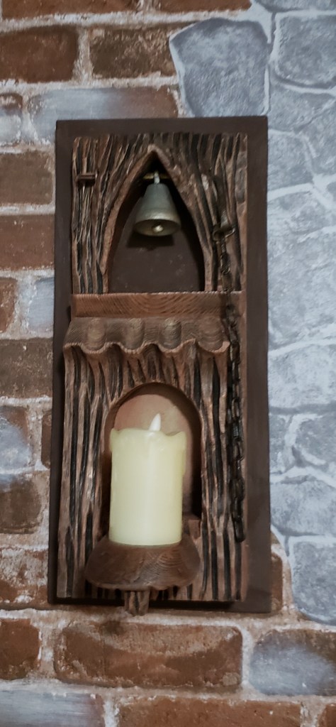 Finally, I found what I think must be a one of a kind find, a combination bell and candle carved out of wood. It reminds me of pixie architecture It’s everything I didn’t know I needed with a chunky rustic flare that I felt fit in well with the entry to the tavern. The only downside is that it was painted solid black on a green backer board so I went to work. This is dry brushed with the same chalk paints and more rub ‘n buff sprinkled in.
