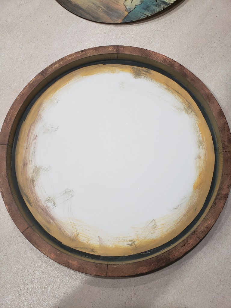 UPDATE: After posting this, I was fired up to finish beefing up the sign so I found a cheap wall-mount, uh… tray? I’m not sure what it was intended to be, actually. It was in the wood section of the craft store, I checked out all the wood circles both flat and inset. I ended up thinking the size and shape of this one were perfect. I figured the diameter would work and the depth would give it a “barrel end” look, so I jumped in face first. After banging the sharp edge a bit, I used thinned chalk paint, drew lines with a paint pen at this point so they’d be less clean than if I applied at the end, layered on rub ‘n buff, then stippled on some straight paint. Once this was dry and I had washed my hands a few dozen times, I globed on E6000 and wiggle-pressed the original thing wood disk into the center.