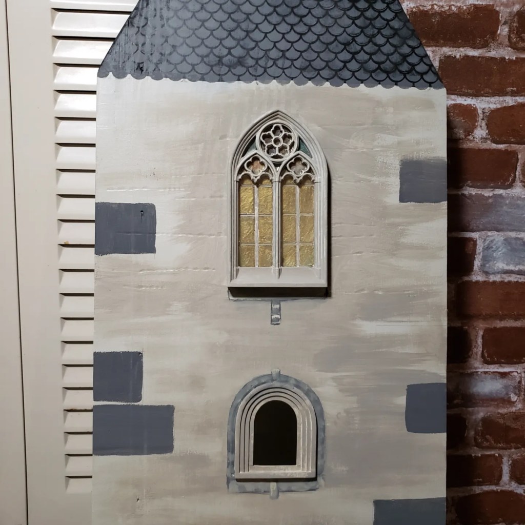 Once the windows were installed I realized the scale was off so this is where I decided I needed a stencil for smaller details. I used a few different paint shades and dry brushed our castle, adding left over wood aging stain over the paint.